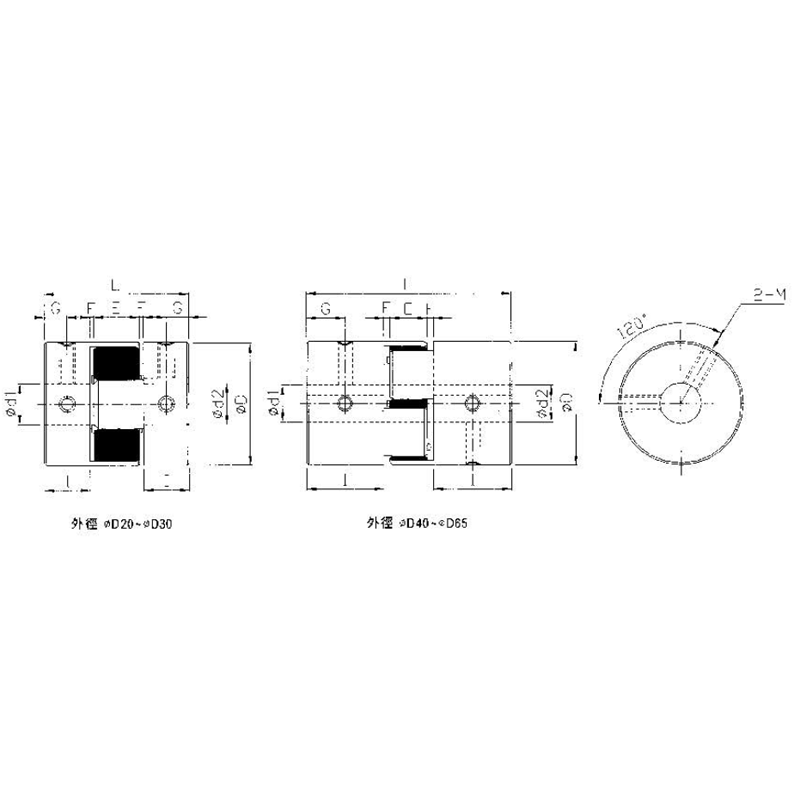 | 型號 | D | I | L | E | F | G | M | d1xd2 標準孔徑 公差(H8) | Mass 質量 (g) | |